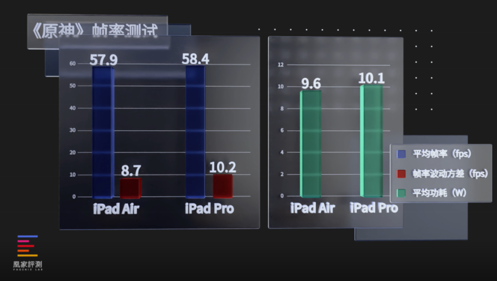 我们再看实际场景下的表现,在同一室温环境下,半小时原神过后,iPad Air平均帧率57.9,帧率波动8.7,平均功耗9.6W。iPad Pro平均帧率58.4,帧率波动10.2,平均功耗10.1W,整体表现,在游戏中两款设备基本处于同一水平。