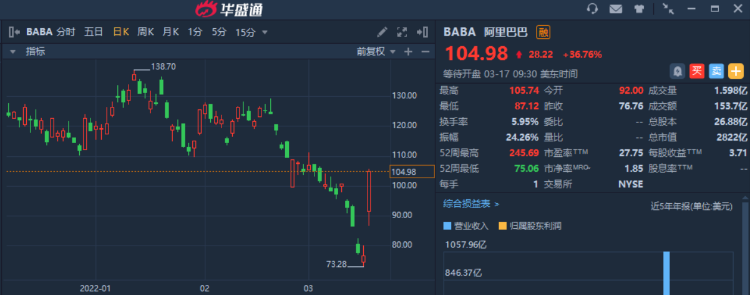 港股、在美上市中概股暴涨,3月16日恒生指数涨9.08%,恒生科技指数涨22.2%,阿里巴巴港股涨27.3%报收90港元,在美上市BABA涨36.76%报收104.98美元。