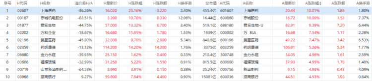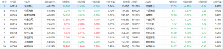 以A股收盘时间,AH股涨幅前10如下: