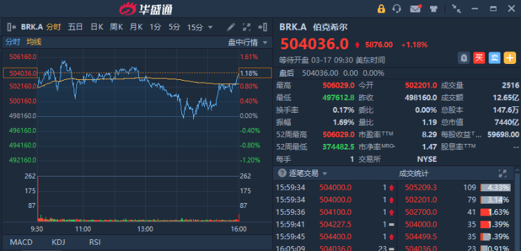 美东时间3月16日周三,伯克希尔哈撒韦公司Berkshire Hathaway A类股实现了一个重要的里程碑,股价突破50万美元,创下历史收盘新高。 截至收盘,伯克希尔A类股周三上涨1.18%,报每股504036美元,这是该股有史以来首次收于50万美元上方。