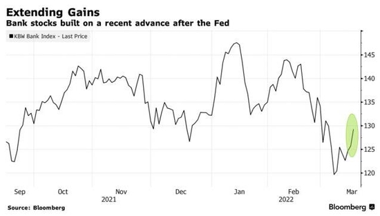 在美联储时隔逾三年再度步入紧缩周期后,包括摩根大通、美国银行和花旗集团等在内的多家美国大型银行,无疑正成为这一决定下的大赢家。周三,银行股是标普500指数中表现最好的板块之一,涨幅达到3.7%,触及了两周以来的最高水平。KBW银行指数也止住了过去一个月的颓势,全天大幅反弹逾3.6%。