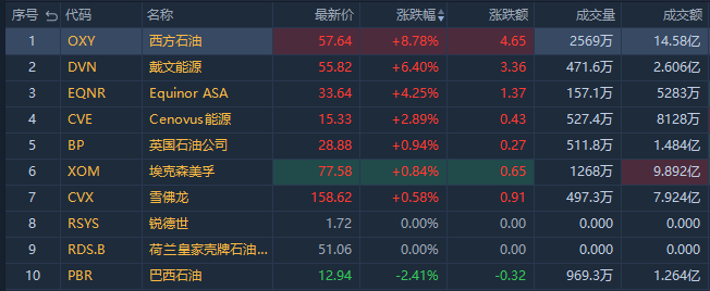 华盛资讯3月17日消息,美股盘中,油气板块股票普遍走高,截至发稿,西方石油(OXY)涨近9%,戴文能源(DVN)涨超6%,Equinor ASA(EQNR)涨超4%,Cenovus能源(CVE)涨近3%,英国石油公司(BP)、埃克森美孚(XOM)、雪佛龙(CVX)跟涨。