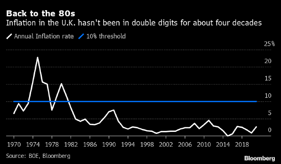 上一次消费者物价指数通胀率超过10%是在1981年,当时是在撒切尔执政期间,利率为12%,经济刚刚摆脱衰退。
