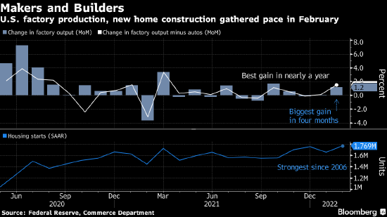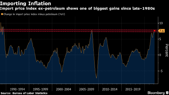消费物价以40年来最快速度上涨。本周的几份报告显示物价压力将持续。虽然油价飙升引起了很多关注,但上月进口成本出现了大幅上涨,即使剔除石油也是如此。2月份生产者价格指数(PPI)创下2010年以来最大同比增幅。