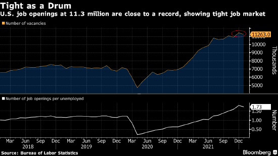 今年初的职位空缺仍然接近纪录高位,反映出鲍威尔提到的劳动力供应极度紧张。1月的职位空缺数量为1,130万个,略低于一个月前的1140万个。