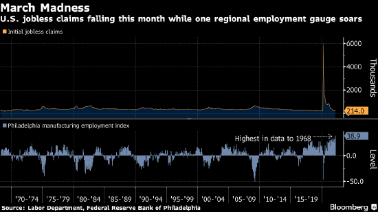 3月的数据显示就业市场依然火爆。上周首次申请失业救济人数处于年内最低值,与1969年以来的水平相去不远。费城联储工厂就业指数攀升至纪录高位。