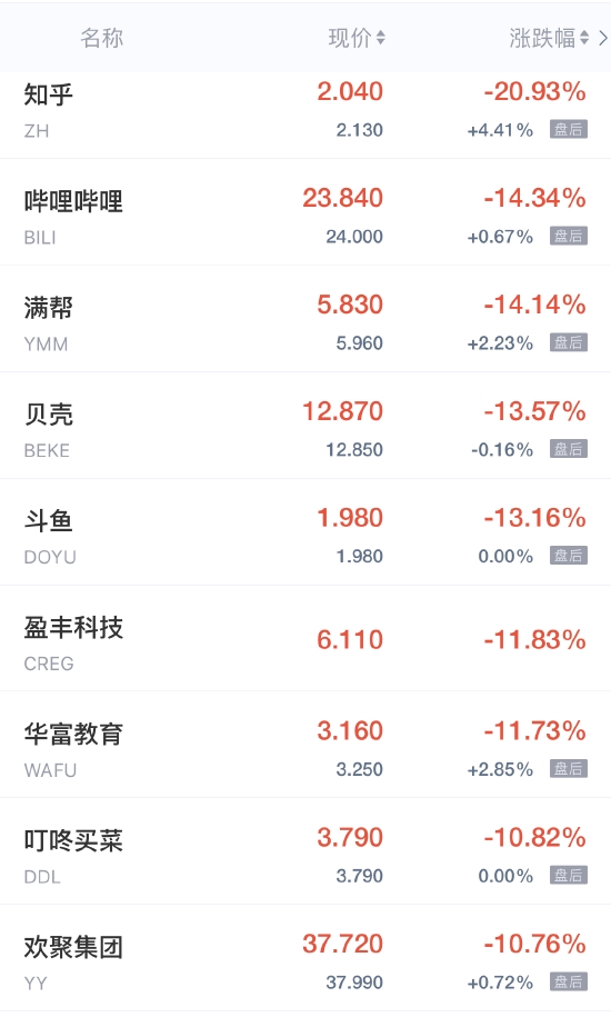 知乎跌近21%,哔哩哔哩、满帮跌超14%,贝壳、斗鱼跌超13%,叮咚买菜跌近11%,欢聚集团、360数科跌超10%,网易有道跌近10%,腾讯音乐、波奇宠物跌超9%,网易跌近9%,爱奇艺、唯品会跌近8%,拼多多、腾讯ADR、蘑菇街跌超7%,迅雷、虎牙跌近7%,新东方、凤凰新媒体、小牛电动跌超6%,金山云跌超5%,瑞幸粉单跌近5%,阿里巴巴、携程、中网载线、汽车之家、中通、涂鸦智能跌超4%,京东、万物新生跌超3%,每日优鲜跌近3%,百度、高途、前程无忧、达达集团跌超2%。