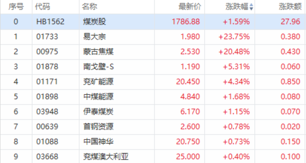 华盛资讯3月18日消息,煤炭板块快速拉升,截至发稿,易大宗涨超23%,蒙古焦煤涨超20%,兖矿能源涨超4%,中煤能源涨超1%,中国神华和兖煤澳大利亚微涨。