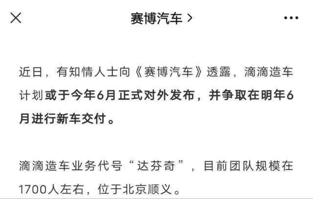 不造车的滴滴也要食言造车了。日前,有消息称滴滴造车计划或于今年6月正式对外发布,并争取在明年6月进行新车交付。