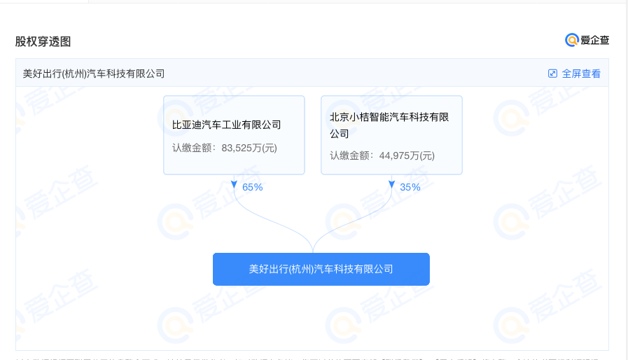 只不过这种说法更像是自我安慰,一种大家都不会轻易打破的默契。于是自我安慰不造车的滴滴开始寻找代工。2019年11月,滴滴与比亚迪合资成立了美好出行(杭州)汽车科技有限公司。爱企查显示,该公司的控股方为比亚迪,持股65%,滴滴持股为35%。