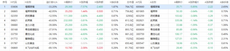 福耀玻璃A股跌5.85%,H股跌7.57%,福莱特玻璃A股跌3.64%,H股涨1.44%,药明康德A股跌3.08%,H股跌3.8%。