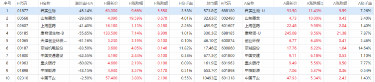 以A股收盘时间,AH股涨幅前10如下: