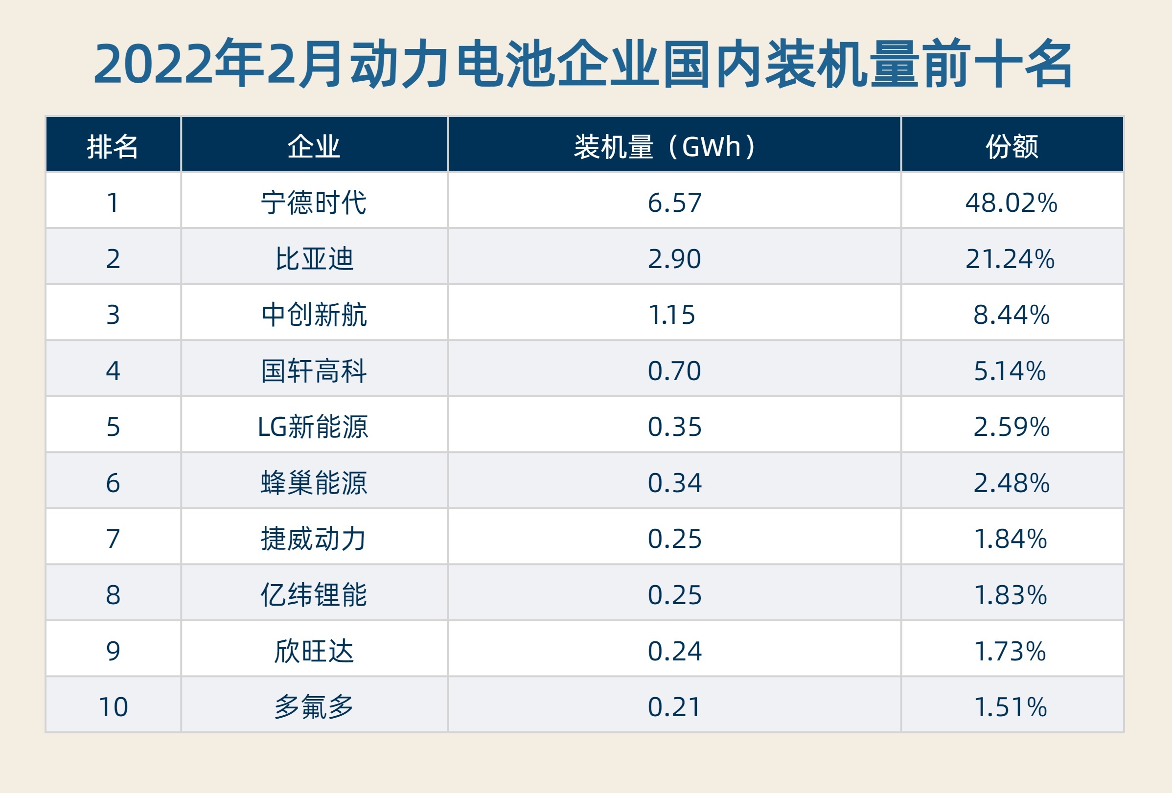 具体到动力电池供应商来看,2月,我国动力电池装机量排名前三的企业分别是宁德时代(300750.SZ)、比亚迪(002594.SZ)和中创新航。其中,仅宁德时代一家的动力电池装机量就占据近一半的市场份额,不过其市占率较上月下滑0.34个百分点。