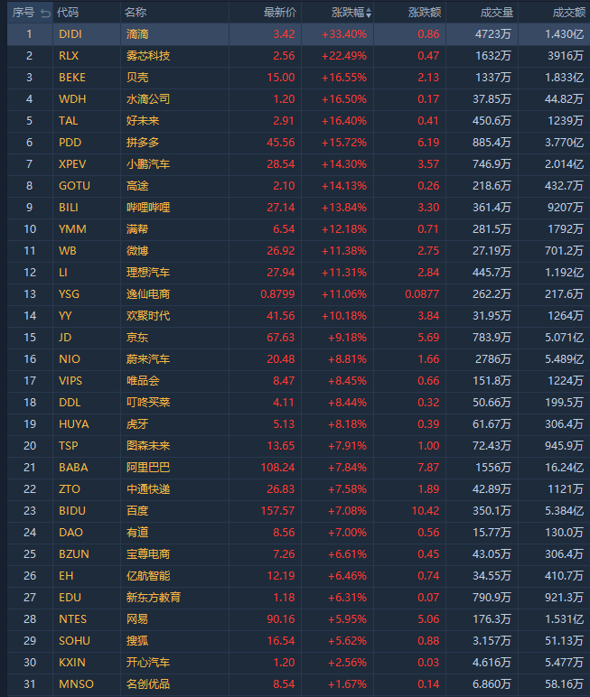 京东(JD)涨超9%,蔚来汽车(NIO)、叮咚买菜涨超8%,阿里巴巴(BABA)涨超7%。
