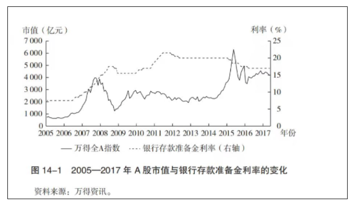 我们做过一个统计,1992年之后,在美国市场,股市与货币政策之间的关系开始变得不太可靠。其间,出现多次美联储收紧货币政策(比如加息)而标普500持续攀升的情况。1994—2012年,美联储在首次放松银根时买入股票、首次紧缩银根时卖出股票时,大盘在此期间的累积收益率为55%,而那些实施买入持有策略的投资者实现的收益率为212%,几乎是前者的4倍。股票市场和货币政策在美国不存在一一对应的关系,同样,在中国,A股市值与银行存款准备金利率也不存在一一对应的关系(见图14-1)。
