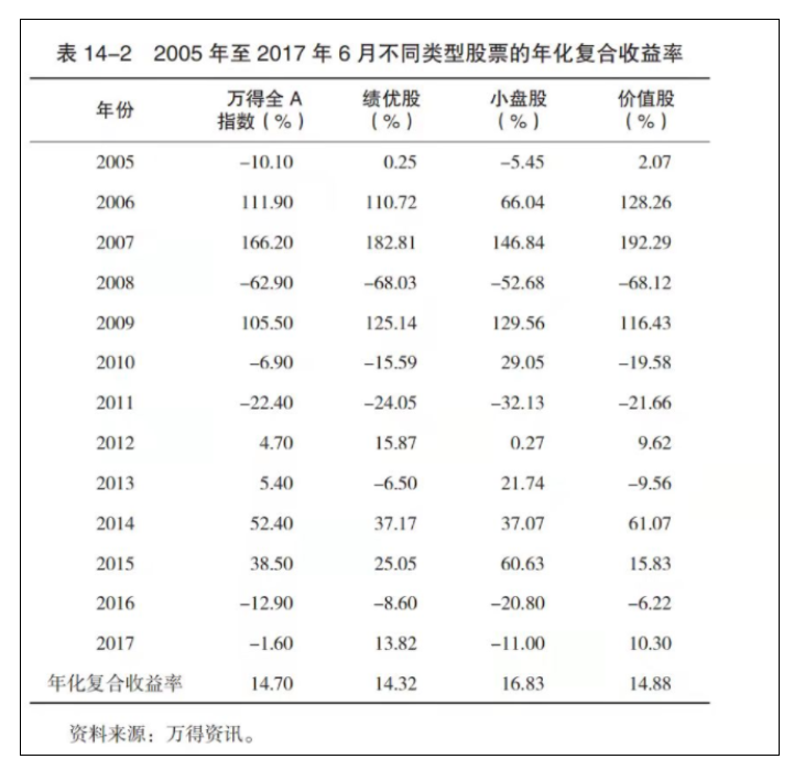 耐心与坚持是投资最好的朋友,不管是价值股、绩优股,还是小盘股,任何一个投资策略2005年至2017年6月的年化复合收益率都在15%附近,不分上下(见表14-2)。