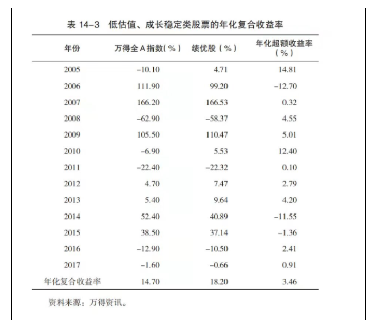 牛市和熊市对长期投资者来说并不重要,2005年至2017年6月,如果始终选择低估值、成长稳定类股票,年化复合收益率为18.20%,年化超额收益率为3.46%(见表14-3)。