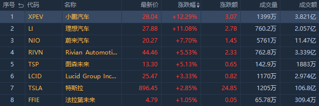 华盛资讯3月18日消息,美股盘中,新能源车概念股普涨,截至发稿,小鹏汽车(XPEV)涨超12%,理想汽车(LI)涨超11%,蔚来汽车(NIO)涨超7%,Rivian(RIVN)、图森未来(TSP)涨超5%,Lucid(LCID)涨超3%,特斯拉(TSLA)涨近3%,法拉第未来(FFIE)涨超1%。