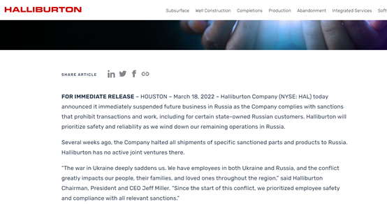 新闻稿还提及,哈里伯顿早在几周前已停止向俄罗斯运送所有特定受制裁的零件和产品。