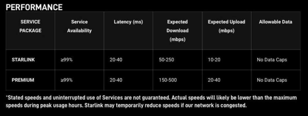 而Premium高级付费套餐包含了一根更高性能的天线,下行速率150-500Mbps、上行速度20-40Mbps,延迟20-40ms,月费500美元,硬件成本3000美元,这项服务将于今年第二季度开始交付。