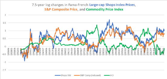 图K. 商店股票不喜欢高商品通胀或增长冲击。(数据来源:Fama-French、Shiller、世界银行、Warren & Pearson、圣路易斯联储)