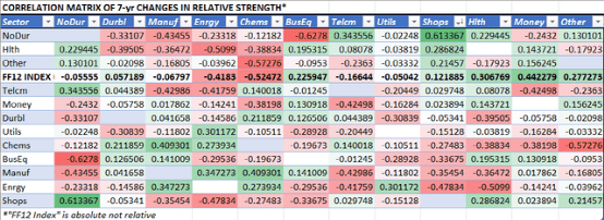 下表是一个相关矩阵,显示了自1926年以来Fama-French 12个行业的7年相对表现: