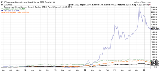 原标题:科技股崩盘下,亚马逊和特斯拉是否会拖累XLY板块股价?