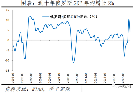 俄罗斯产业结构较为单一,制造业体量仍在、但产业链不完整,资源型行业占比较高。截至2021年9月,俄罗斯采掘业增加值占GDP约13%的比重;制造业占比16%。2009年-2019年,俄罗斯GDP年均增长2%;人均GDP年均增长1.7%。2019年消费、投资和出口对GDP的拉动率约为2.48%、0.54%以及-0.54%。