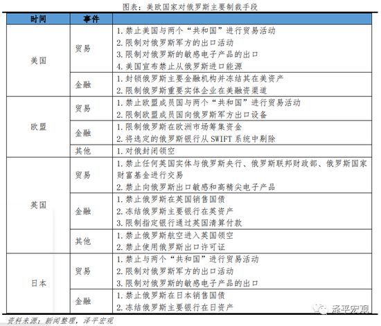 俄乌冲突以来,以美、欧为首的经济体对俄罗斯发出制裁。自2月21日以来,美国、欧盟、英国、澳大利亚、日本、韩国等超过46个经济体宣布对俄罗斯实施制裁,涉及金融、能源、科技以及军事等领域。主要有:1)金融方面,部分俄罗斯银行被SWIFT系统剔除,但能源相关银行被排除在外;2)科技方面,美欧停止向俄罗斯出口高精尖电子产品;3)军事方面,不再对俄罗斯军方出口战争必需的技术及设备;4)能源方面,美国宣布禁止从俄罗斯进口能源。