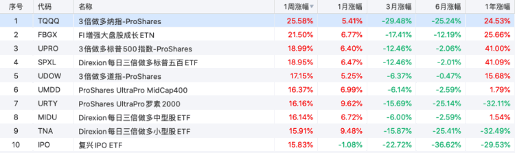 本周表现好的股指ETF中,以做多类ETF居多;3倍做多纳指ETF $TQQQ 周累涨25.58%,3倍做多标普500指数-ProShares $UPRO 周涨18.99%。