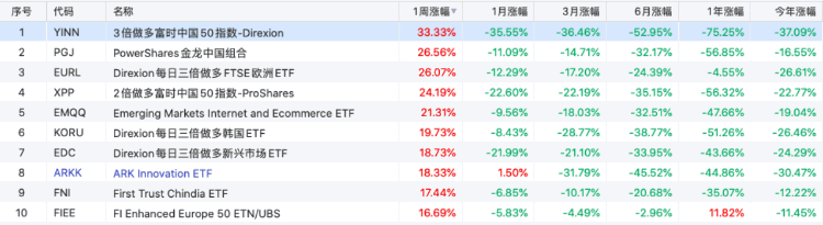 从ETF全周涨幅榜来看,Direxion每日二倍做多中证中国互联网指数ETF $CWEB 涨幅居首,本周累计上涨46.12%(AGA已退市);其次是3倍做多富时中国50指数-Direxion$YINN 周累涨33.33%,KraneShares中国海外互联网ETF $KWEB 也涨幅居前,周累涨28.75%。