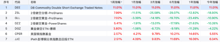 商品ETF中,本周做空商品类ETF涨幅居前,其中DB Commodity Double Short Exchange Traded Notes $DEE 周累涨11.01%。2倍做空白银ETF $ZSL 周累涨7.99%,2倍做空黄金ETF $GLL 周累涨7.02%。