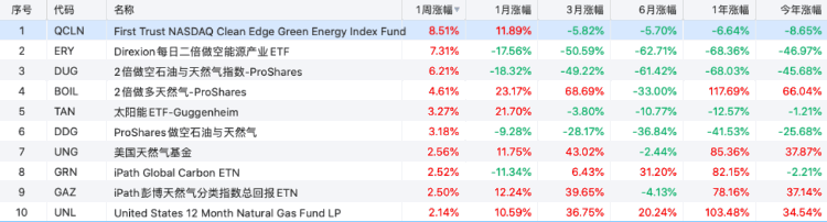 本周能源ETF涨幅榜方面,First Trust NASDAQ Clean Edge Green Energy Index FUND $QCLN 涨幅居首,周累涨8.51%。Direxion每日做空能源产业ETF $ERY 周累涨7.31%。2倍做空石油与天然气指数ETF $DUG 周累涨6.21%。