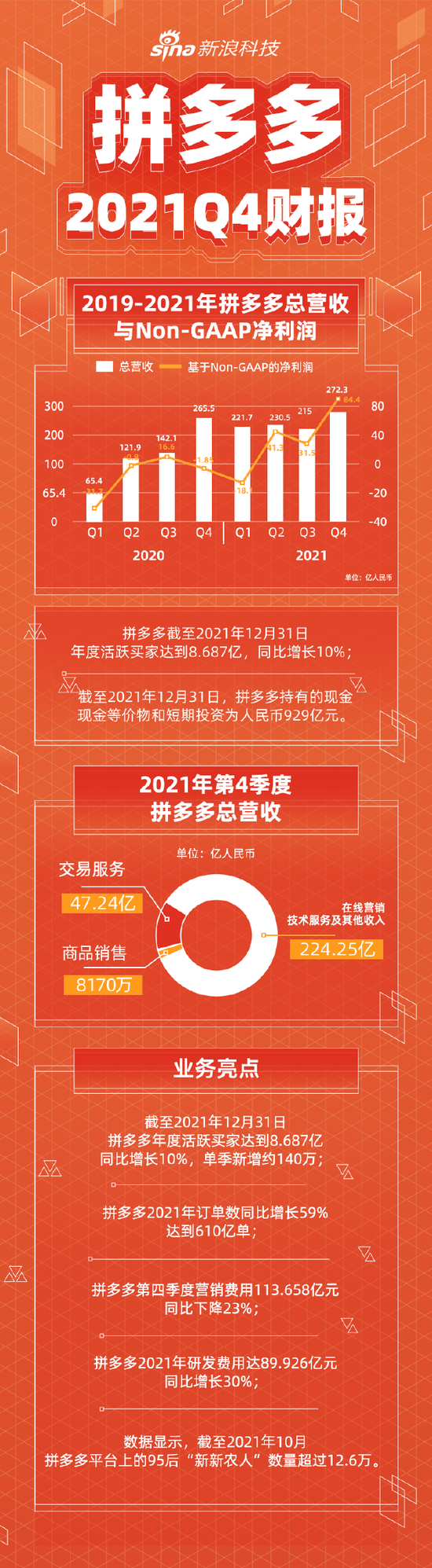 截至2021年12月31日,拼多多年度活跃买家达到8.687亿,同比增长10%,单季新增约140万。截至2021年12月31日的12个月期间,商品交易总额为24410亿元人民币,比截至2020年12月31日的12个月期间的16676亿元人民币增长了46%。