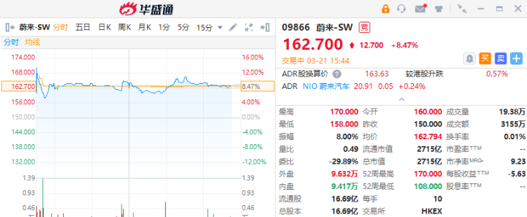 华盛资讯3月21日消息,蔚来-SW港股盘中一度涨13.33%,报170港元创上市新高。