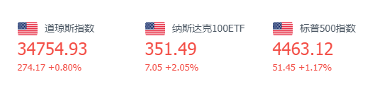 上周五美股三大股指齐收涨。道指 $DJI 收涨0.80%,报34754.93点;纳指 $IXIC 涨2.05%,报13893.84点;标普500指数 $SPX 涨1.17%,报4463.12点。