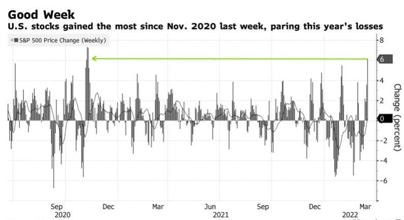 在该悲观预期出现之前,尽管美联储加息并证实了其鹰派立场,而且战争仍在继续,标普500指数上周反弹,上涨6.2%,这是自2020年11月以来的最大单周涨幅。尽管如此,在2021年强劲上涨并连续创下历史新高之后,美国主要股指今年已累计下跌逾6%。