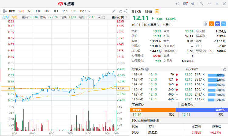 华盛资讯3月21日消息,美股盘中,热门中概股多数走低。截至发稿,贝壳(BEKE)跌超14%,哔哩哔哩(BILI)、京东(JD)跌超7%,雾芯科技(RLX)跌近7%,阿里巴巴(BABA)跌近5%,拼多多(PDD)跌超3%。