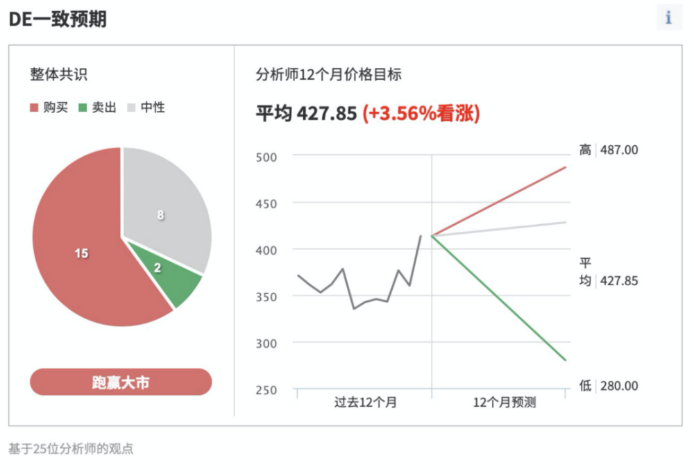 根据英为财情Investing.com的一致预期工具显示,目前市场给予迪尔股份的12个月目标价为427.85美元,在我们调查的25为分析师中,有15位给予该股“买入”评级,8位分析师持“中性”评级,两位分析师建议“卖出”。