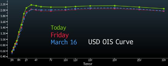 评论称,作为未来利率预期的最佳指引,OIS曲线上周的收盘水平,与3月16日FOMC会后鲍威尔讲话结束时的水平几乎一样。但在今天,它大幅升高。