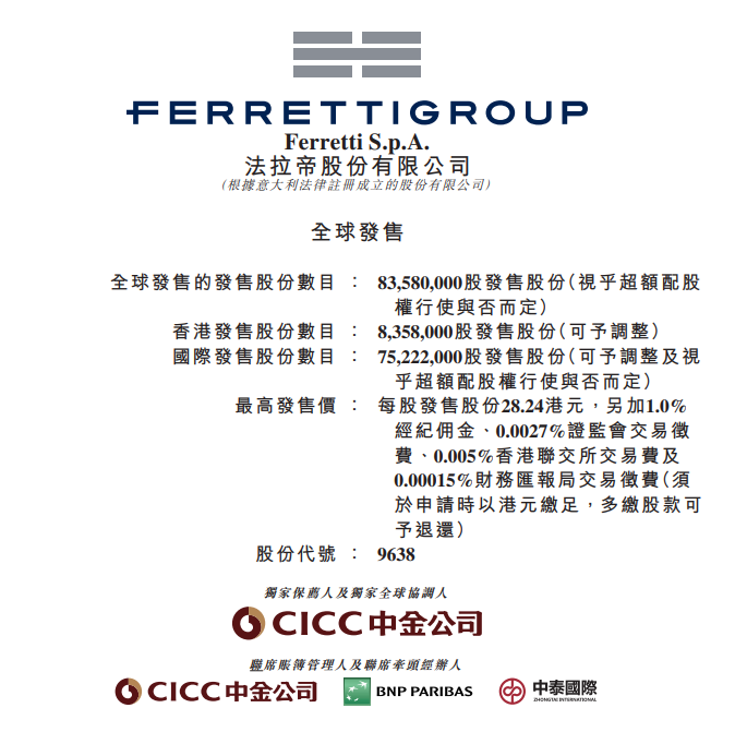 华盛资讯3月22日消息,法拉帝于3月22日-3月25日进行招股,公司拟全球发售8358万股股份,招股价每股21.82港元-28.24港元。未计手续费,每手100股入场费2852.46元。前往新股中心,申购新股>>