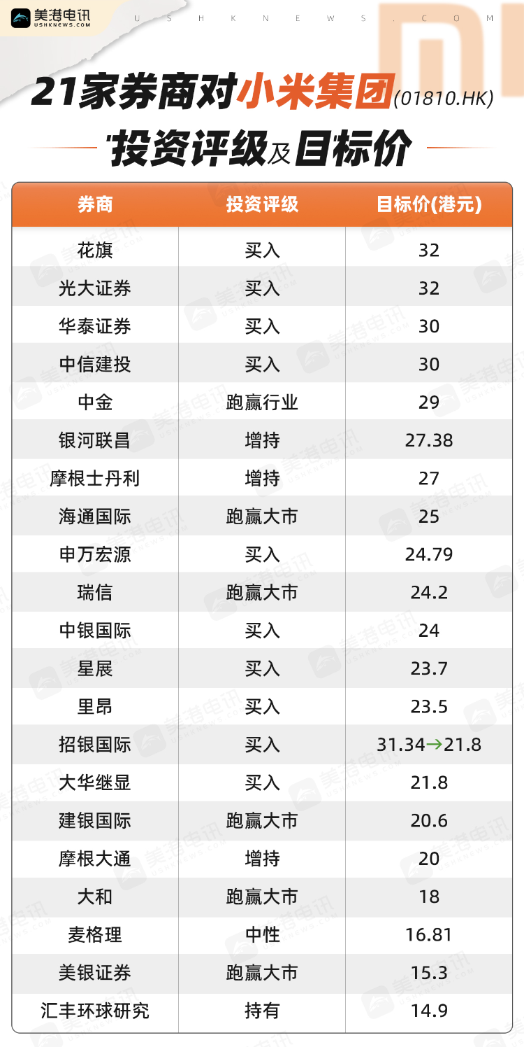 以下为21家券商对小米集团(01810.HK)的评级和目标价最新调整: