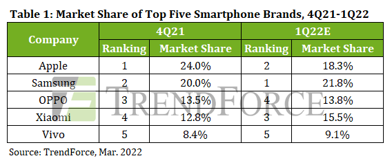 下图为全球排名前五的智能手机品牌:(2021年Q4-2022年Q1)