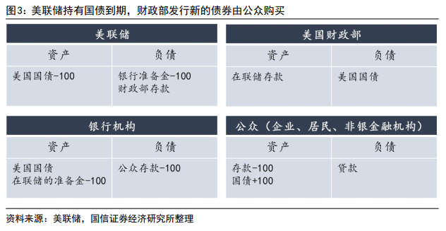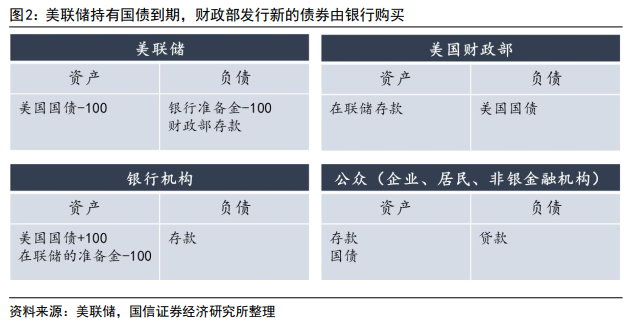 情况二:如果美联储持有的100美元国债到期,财政部发行100美元新的债券,财政部国债余额不变。如果发行的国债由银行购买持有,各机构资产负债表变化如图2,美联储资产端“美国国债”科目减少100美元,负债端“银行准备金”减少100美元;银行资产端“美国国债”增加100美元,但“在联储的准备金”减少100美元;财政部和公众资产负债表不变。