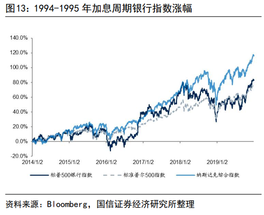 第一轮加息周期为1994年2月至1995年2月,基准利率从3.00%上调至6.00%。该阶段(1994/2/4-1995/2/1)标普500银行指数涨幅为-2.4%,同期标普500指数和纳斯达克指数涨幅分别为0.1%和-2.4%。此轮加息周期市场表现平稳,银行指数和大盘指数涨跌幅在小个位数。