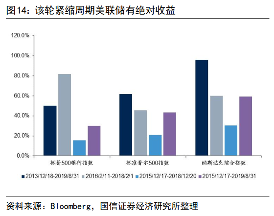 2013年12月18日议息会议正式启动taper至2019年8月结束缩表,标普500银行指数涨幅为50.2%,同期标普500指数和纳斯达克指数涨幅分别为61.6%和95.6%。美联储加息到停止缩表阶段(2015/12/17-2019/8/31)标普500银行指数涨幅为30.0%,同期标普500指数和纳斯达克指数涨幅分别为43.3%和59.2%。