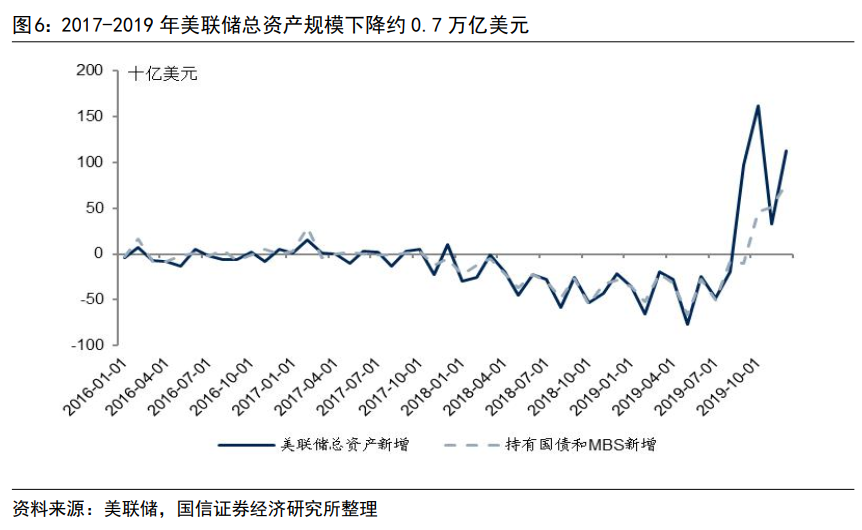 美联储于2017年10月正式启动缩表,2019年8月停止缩表,比预定的锁表方案提前了两个月,主要是为了2019年8月的降息。2019年8月末美联储总资产规模降到3.76万亿美元,较2017年10月末下降了0.70万亿美元。