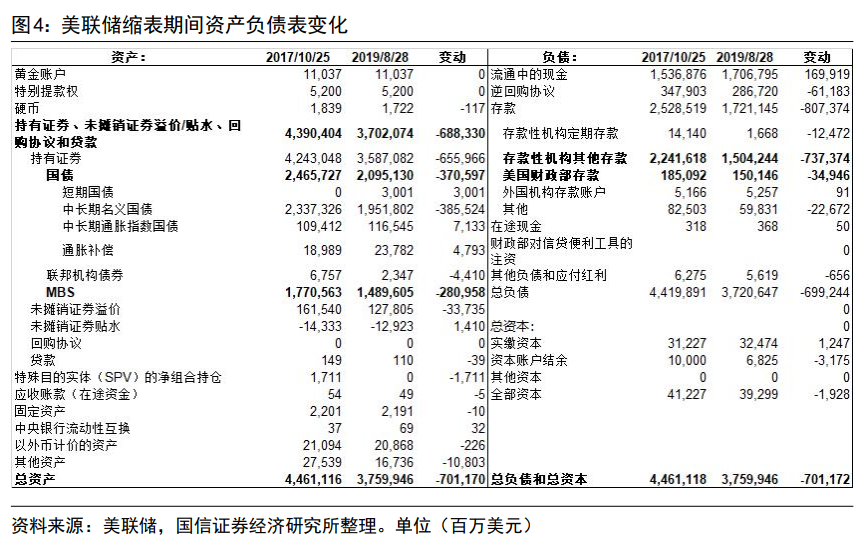 2017年10月至2019年8月缩表期间美联储资产负债标变动如图4,资产端持有国债和MBS分别减少3706亿美元和2810亿美元,负债端银行准备金和财政部存款分别减少7374亿美元和349亿美元。