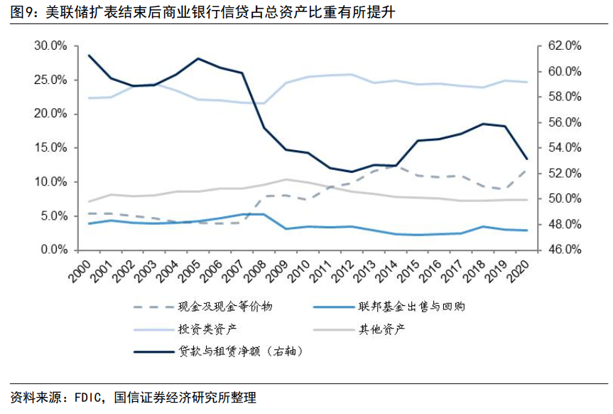 商业银行信贷比重提升一方面是现金及现金等价物资产因美联储缩表压缩而被动提升,另一方面该阶段美国经济复苏反弹,银行信用风险偏好有所提升,在总资产增速回落的情况下增加了信贷类资产配置。