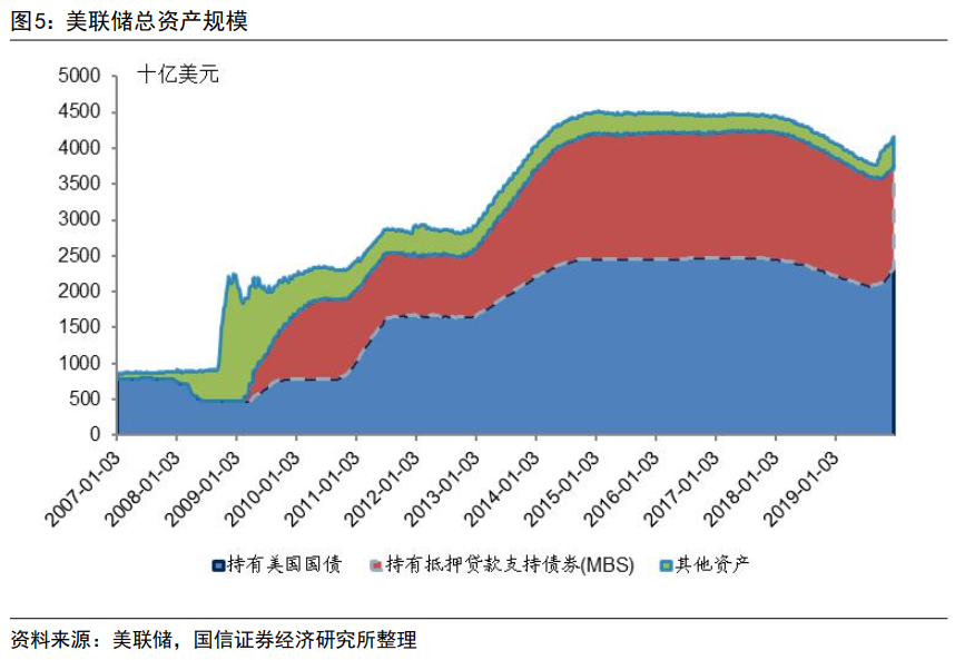 三是缩表阶段,美联储总资产下降了约0.70万亿美元。美联储2015年底首次加息约两年后才开始缩表,美联储于2017年6月公布缩表方案,缩表的主要方法是逐渐减少对到期债券的再投资:初始每月减少国债60亿美元、MBS40亿美元的再投资;随后每隔3个月再追加减少国债60亿美元,MBS40亿美元,直至减少量达到国债300亿美元,MBS200亿美元的上限。